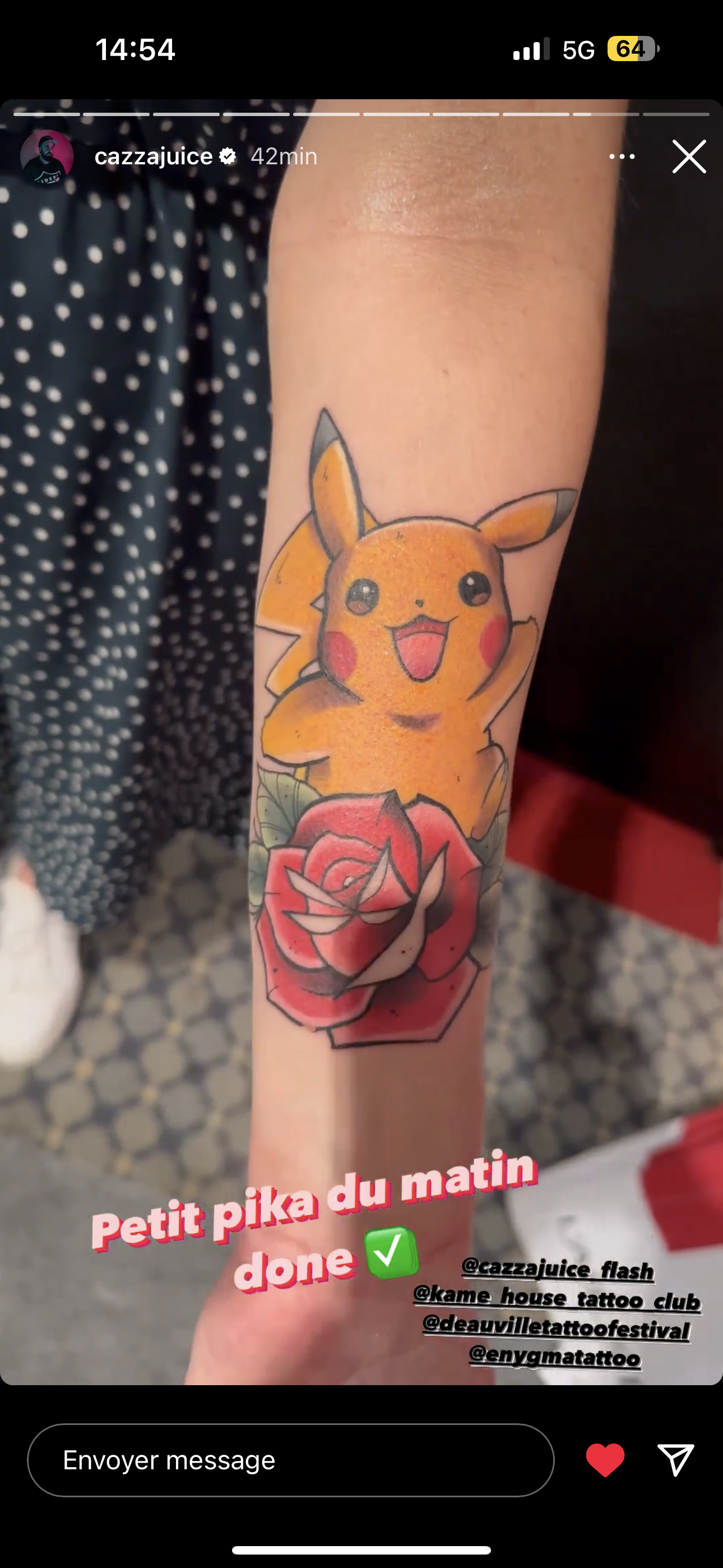 Je me suis fait tatoué un pikachu sur l’avant bras, à la convention de Deauville, je suis ravie du résultat ! Un super travail, le dessin les couleurs sont magnifiques ! Et un tatoueur très agréable ! Je le recommande 😁