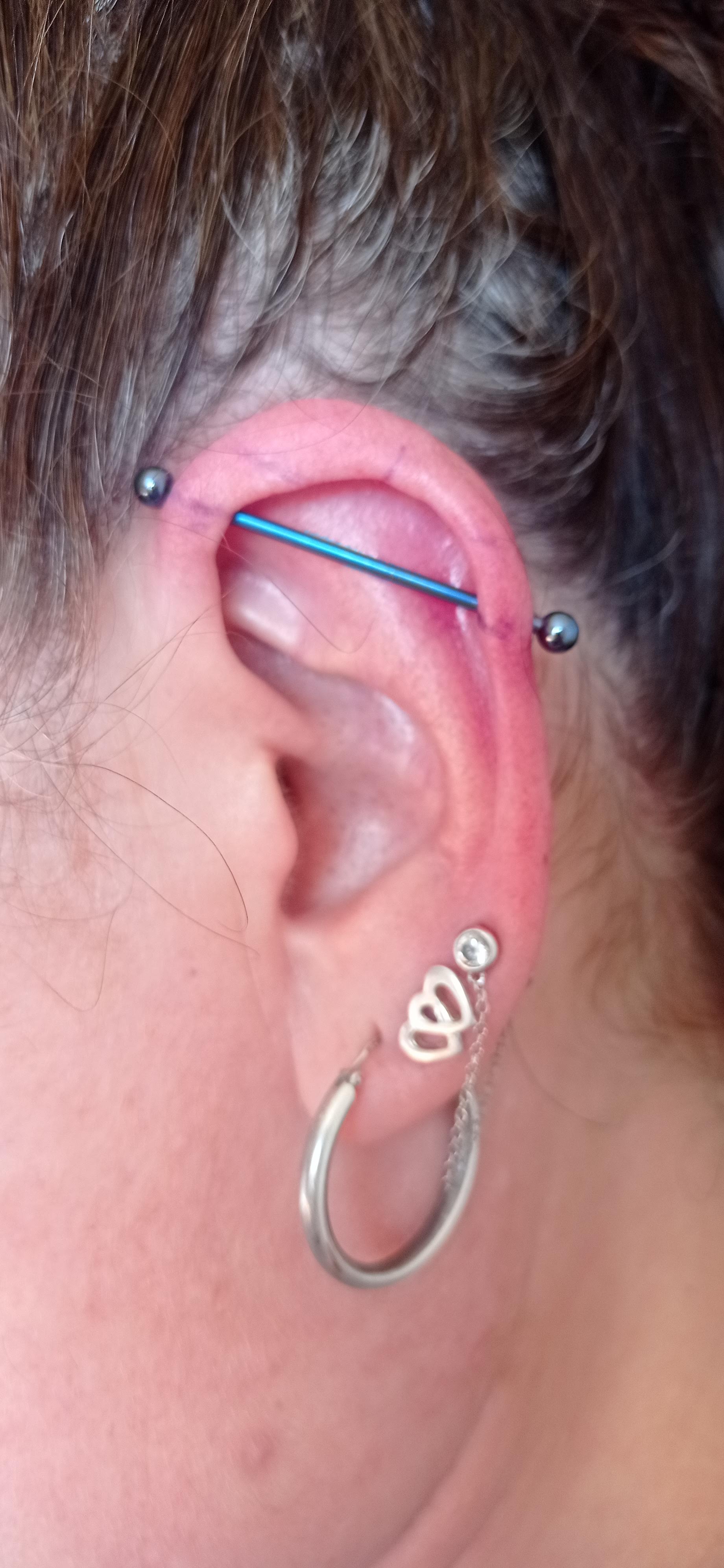 Piercing industriel réalisé chez eux avec Kleden, aucun soucis au moment du piercing, tout a été fait avec soin. Ils sont aussi super disponibles si jamais vous avez des problèmes ou des questions au cours de la cicatrisation, je recommande vraiment. (Photo prise le lendemain du piercing)